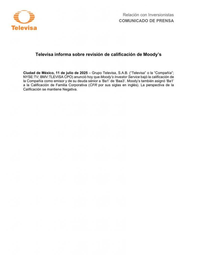 La decisión de Moody’s se basó en la persistente disminución de suscriptores en los negocios de Televisa, especialmente en su segmento satelital Sky y en servicios de banda ancha, los cuales han mostrado un crecimiento limitado frente a la competencia.