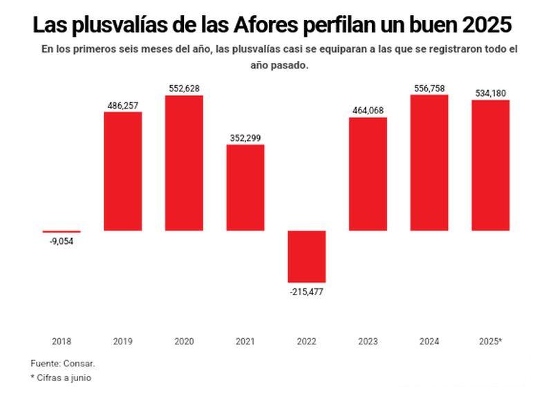El monto de plusvalías del primer semestre del año casi iguala a las plusvalías de todo el 2024, cuando las Afores registraron 556,758 millones de pesos.
