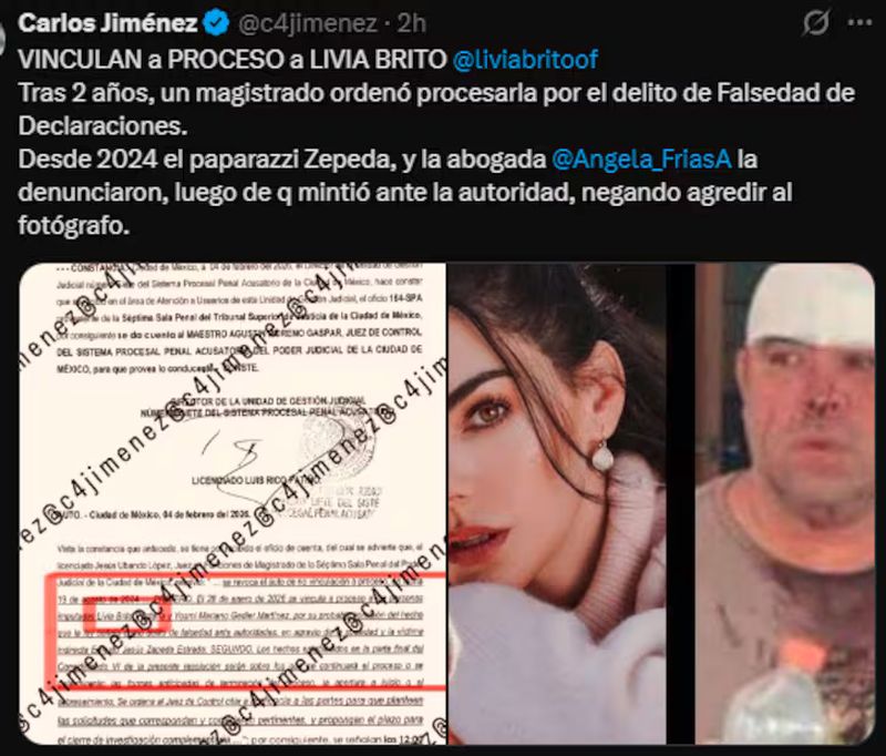 Jiménez escribió: «Tras dos años, un magistrado ordenó procesarla por el delito de falsedad de declaraciones. Desde 2024, el paparazzi Zepeda y la abogada @Angela_FriasA la denunciaron luego de que mintiera ante la autoridad, negando haber agredido al fotógrafo».