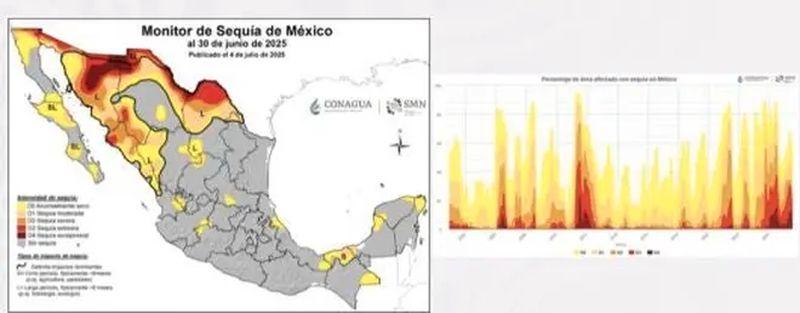 El Monitor de Sequía de México al 30 de junio, establece que 14.4 por ciento del país se encuentra anormalmente seco (D0), 8.5 por ciento tiene sequía moderada (D1), 6.1 por ciento con sequía severa (D2), 4.7 por ciento sequía extrema (D3) y 2.5 por ciento sequía excepcional (D4).