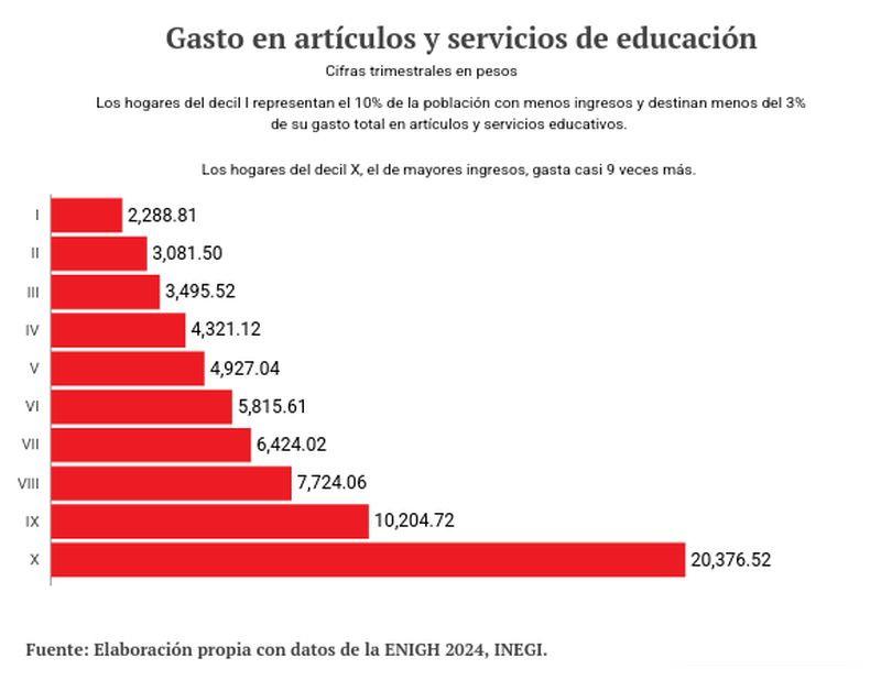 Este comportamiento se refleja en una desigualdad persistente, mientras los hogares del decil más alto gastan hasta 20,376 pesos al trimestre en educación, los del decil más bajo destinan apenas 2,888 pesos.