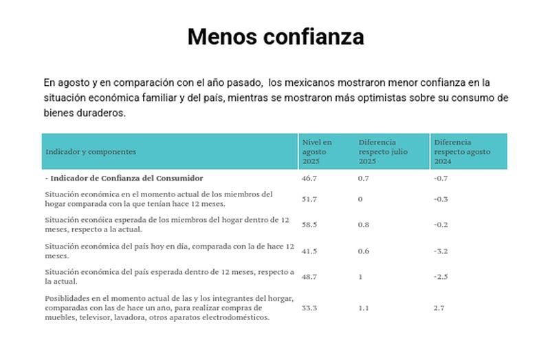 El sentir de los mexicanos respecto a su situación económica no mejora. En agosto, el Indicador de Confianza del Consumidor disminuyó 0.7 puntos respecto al mismo mes del año pasado. Reportó 46.7 puntos, cuando el año pasado fue 47.4 puntos, detalló el Instituto Nacional de Estadística y Geografía (Inegi).