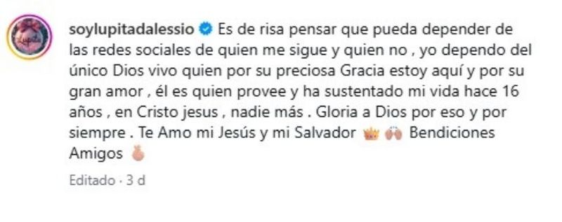 «Es de risa pensar que pueda depender de las redes sociales de quien me sigue y quien no, yo dependo del único Dios vivo», escribió.