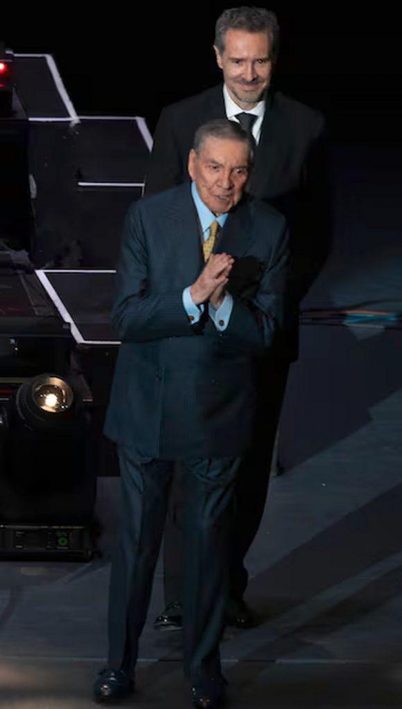 La voz del siglo, el lujo de México, el bien amado, fue como lo definió Castro, y señaló que los amigos también reconocen a los amigos y hoy Mijares estaba ahí para homenajear a uno, entonces apareció el cantante con un smoking blanco y negro, para interpretar “La gloria eres tú”.