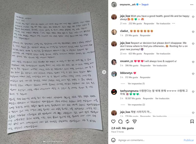 En la versión en inglés de su carta, publicada también en Instagram, Lee se dirigió directamente a su fandom: “De todas las cosas que mi corazón quiere decir ahora mismo, verdaderamente deseo decir gracias. Gracias por amarme, apoyarme y forjarme para convertirme en quien soy hoy”.