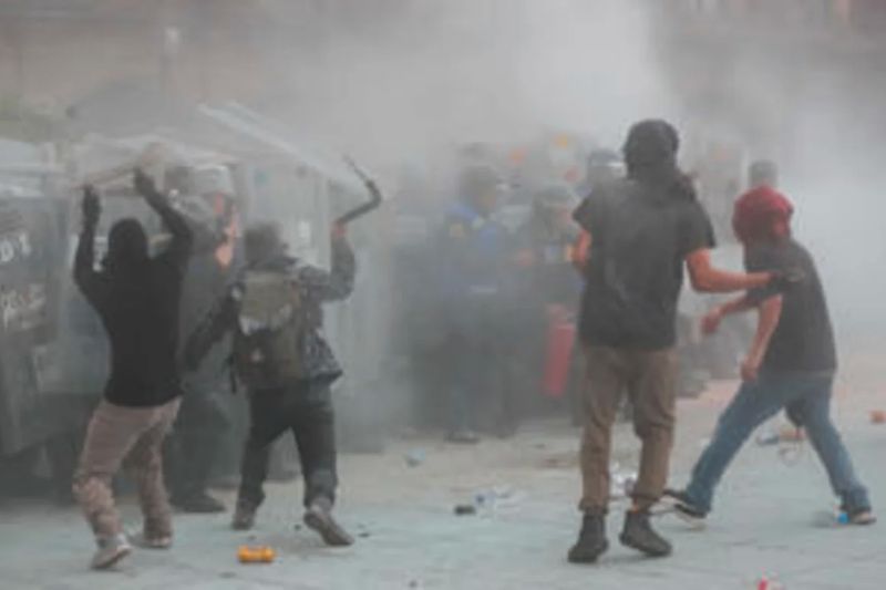 En el Zócalo la protesta se dividió en dos: los manifestantes que querían llevarla a cabo de manera pacífica y otro grupo que lanzó piedras, petardos, bombas molotov y cubetas de pintura a la policía.