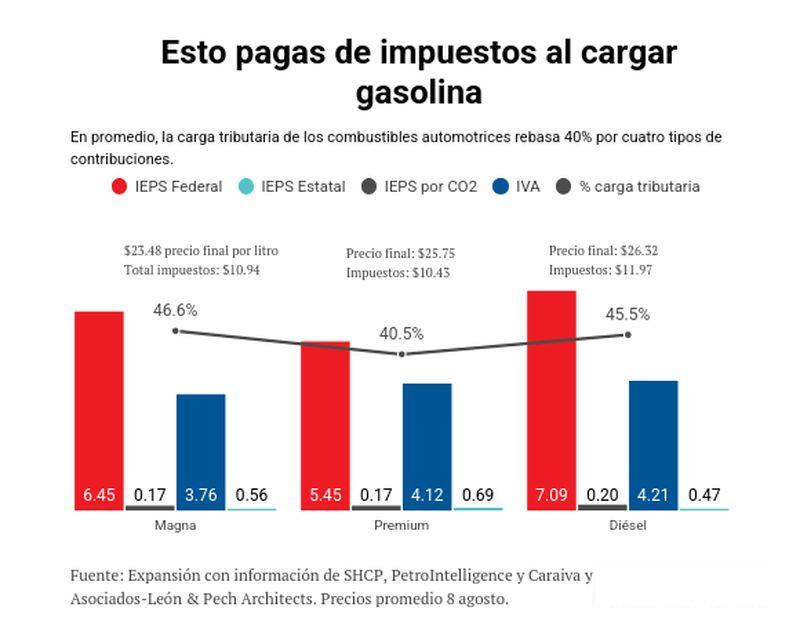 El cobro de estos impuestos significó 45.5% del precio final del litro de diésel, y el 40.5% por litro de gasolina Premium, también de acuerdo al precio promedio nacional registrado el ocho de agosto pasado.