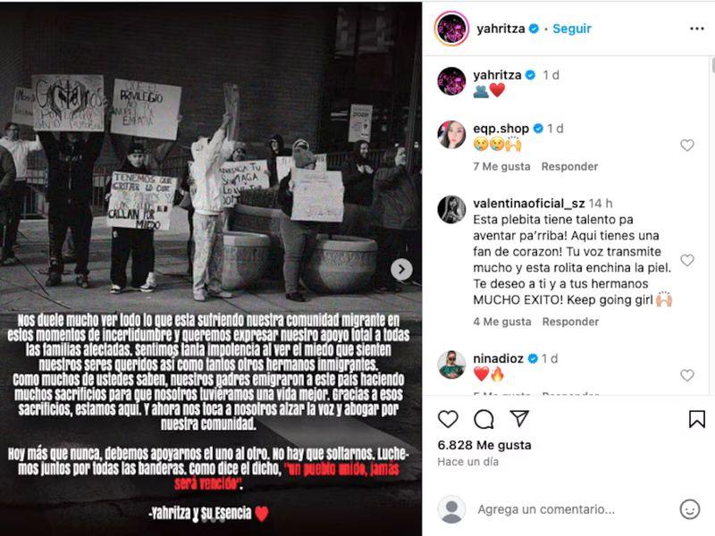 Yahritza Martínez, vocalista principal de Yahritza y su Esencia, abordó el tema a través de un comunicado compartido en redes sociales. Allí, expuso la postura del grupo conformado por ella y sus hermanos Jairo y Mando. Con sus palabras evidenciaron la preocupación personal que sienten por la incertidumbre que afecta a familias migrantes en territorio estadounidense.