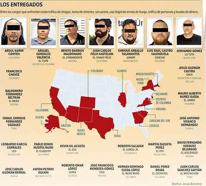 El Departamento de Justicia informó que los entregados enfrentan “cargos relacionados con tráfico de drogas, toma de rehenes, secuestro, uso ilegal de armas de fuego, tráfico de personas, lavado de dinero, y el asesinato de un ayudante de alguacil, otros delitos”.