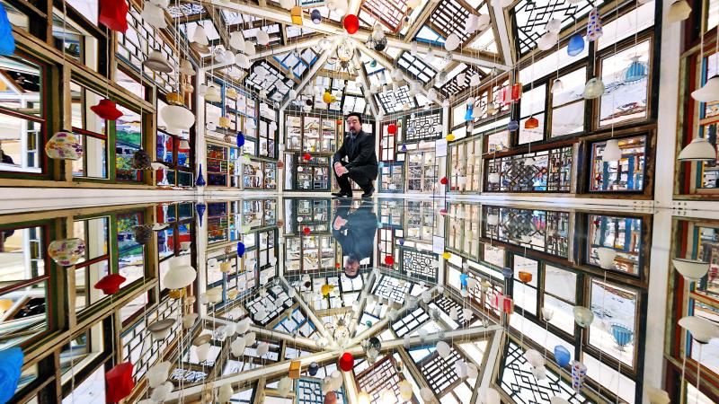 El artista conceptual chino Son Dong (1966), posa en una de sus obras más recientes: una sala de espejos construida con ventanas y puertas de colores, que se creó por invitación de los almacenes Le Bon Marché, en París, Francia.