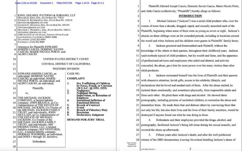 El documento legal, fechado el 27 de febrero de 2026, acusa al Rey del Pop de abusos que se habrían prolongado durante más de una década, iniciando cuando algunos de ellos contaban con tan solo siete u ocho años de edad.