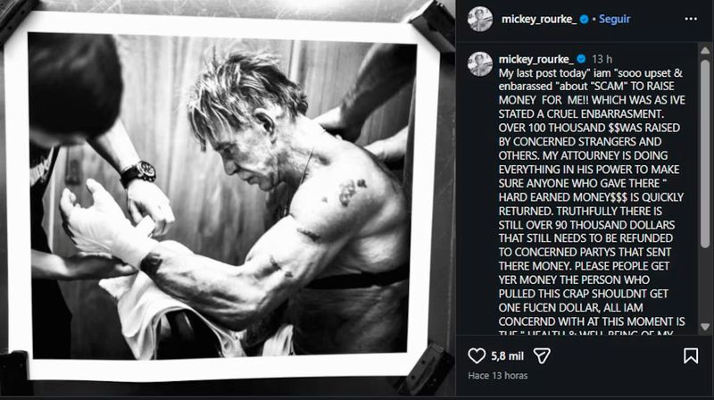 En otro posteo, Rourke fue todavía más severo con sus adjetivos a la campaña de crowdfunding: “Una mentira malvada y cruel para estafar dinero usando mi p… nombre, tan jod… vergonzoso”. Advirtió además que habrá “repercusiones severas” para “el individuo que me hizo esta cosa tan mala”.