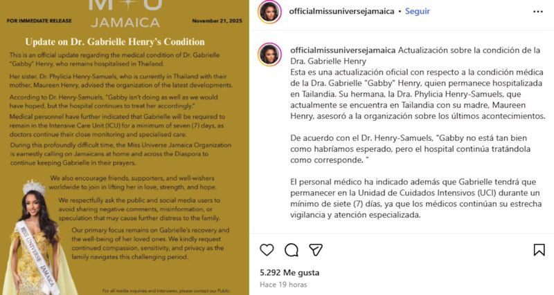 Mediante las redes sociales oficiales de Miss Universo Jamaica, se compartió un comunicado en donde la doctora Phylicia Henry-Samuels, quien es la hermana de Gabrielle, explicó que la oftalmóloga continúa recibiendo atención médica en Tailandia.