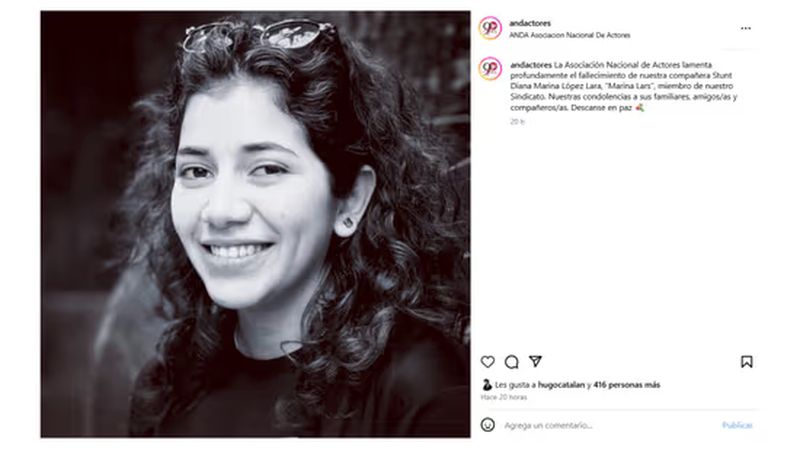“La Asociación Nacional de Actores lamenta profundamente el fallecimiento de nuestra compañera Stunt Diana Marina López Lara, ‘Marina Lars’, miembro de nuestro Sindicato. Nuestras condolencias a sus familiares, amigos/as y compañeros/as. Descanse en paz”, escribieron el 30 de septiembre.
