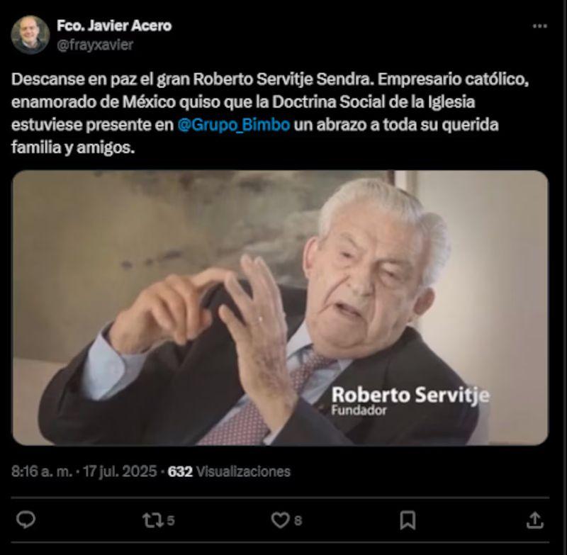 La noticia fue confirmada por el sacerdote agustino Francisco Javier Acero Pérez, un amigo cercano al empresario, quien publicó un pequeño mensaje en X junto a una foto de Servitje.