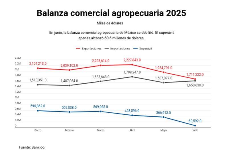La balanza comercial agropecuaria de México se debilitó en el sexto mes del año. El superávit apenas alcanzó 60.6 millones de dólares, cinco veces menos que los 301.3 millones registrados en el mismo mes de 2024, según cifras de Banxico. Las exportaciones sumaron 1,711 millones de dólares y las importaciones 1,651 millones.
