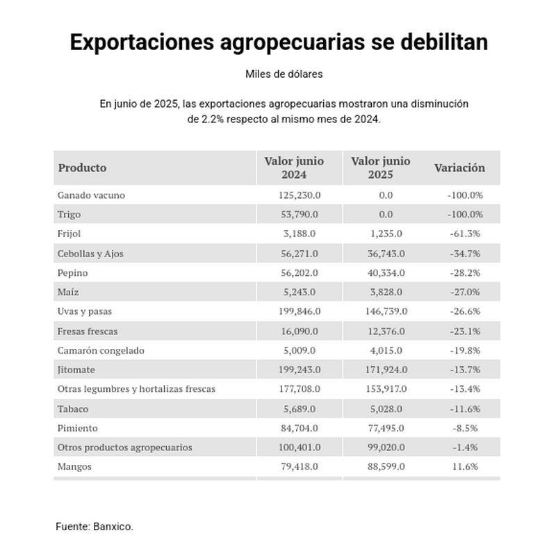 Dentro de la canasta exportadora, el café, la miel, el algodón, los aguacates y los plátanos aportaron 208 millones de dólares adicionales respecto a lo registrado en junio de 2024. Pero esa ganancia no compensó la reducción de exportaciones de ganado bovino, trigo, frijol y cebolla. En general, la lista de retrocesos fue mayor que la de avances.