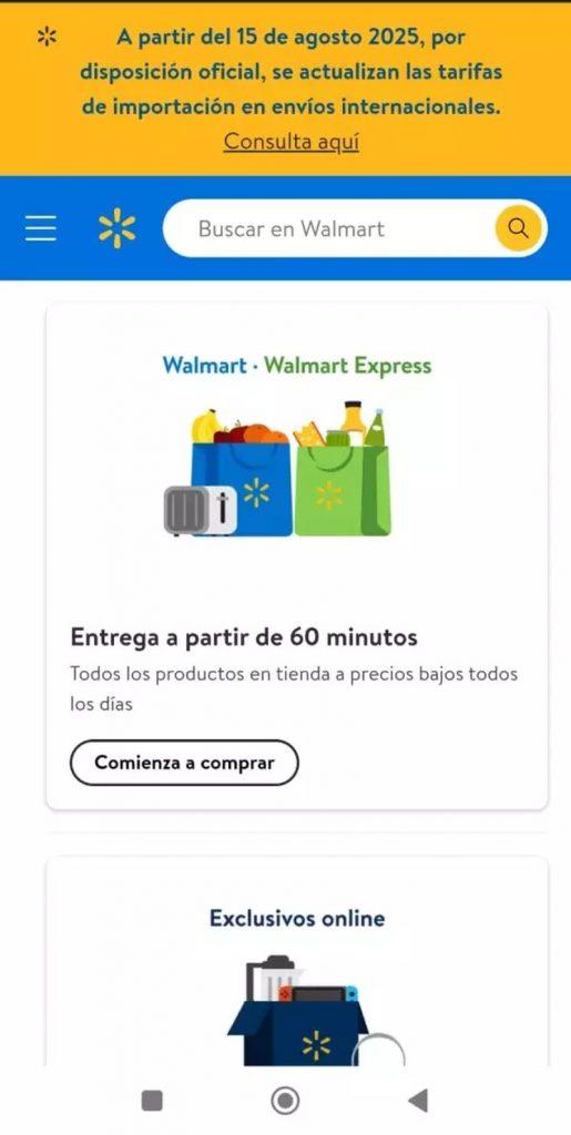 La plataforma de Walmart México también aplica esta modificación de las reglas del comercio exterior, ya que realiza importaciones extranjeras. Se anunció su incorporación por medio de un mensaje al inicio del sitio digital.