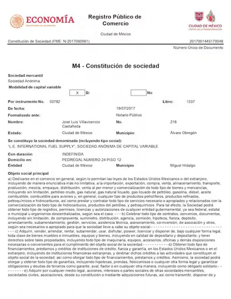 De acuerdo con la investigación de EL UNIVERSAL, L.E. International Fuel Supply, S.A. de C.V., se dio de alta ante el Registro Público de Comercio de la Secretaría de Economía (SE) el 19 de julio de 2017, con sede en Pedregal 24 piso 12, un edificio dedicado a la renta de oficinas en la alcaldía Miguel Hidalgo.