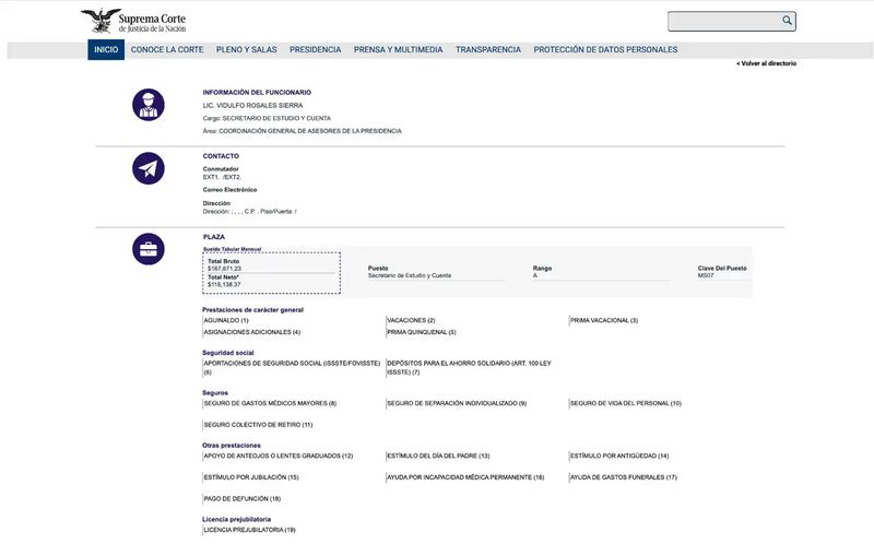 En el portal web del máximo tribunal del país refiere que Vidulfo Rosales ocupa el cargo de secretario de estudio y cuenta y su salario neto aproximado es de 118 mil pesos mensuales y disfrutará de prestaciones como seguro de gastos médicos mayores y seguro de vida.