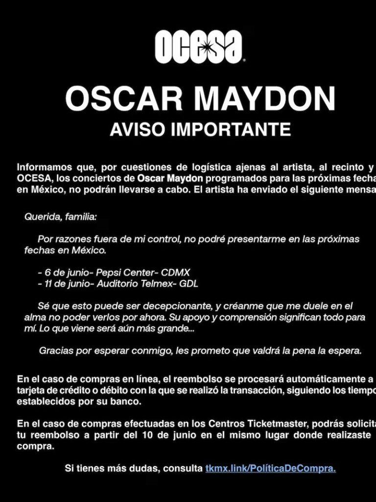 El cantante de regional mexicano Óscar Maydon anunció la cancelación de sus próximos conciertos en México, programados para el 6 de junio en el Pepsi Center de la Ciudad de México y el 11 de junio en el Auditorio Telmex de Guadalajara.