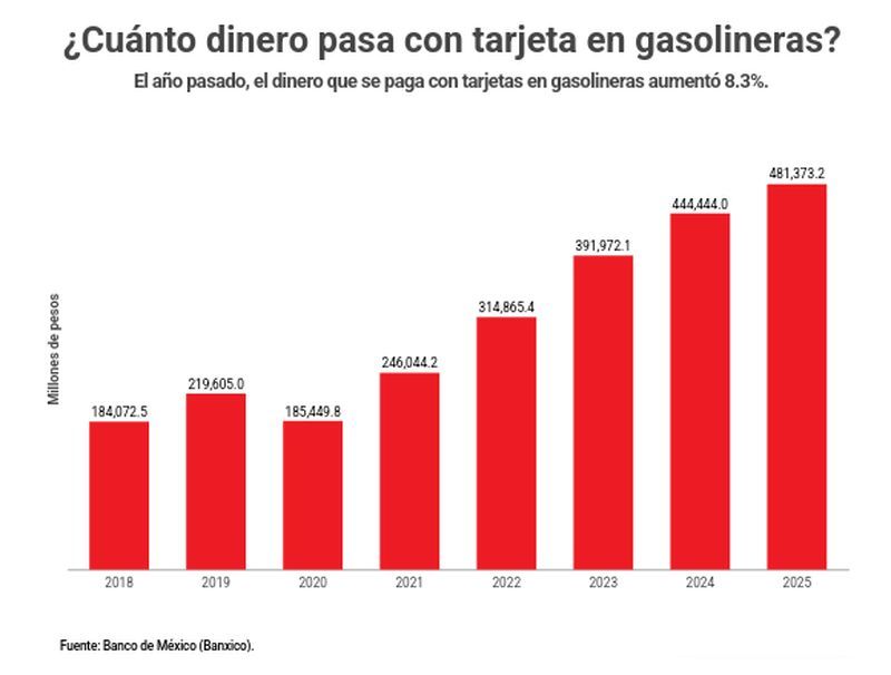 En 2025, los mexicanos hicieron 11,261.8 millones de pagos con tarjeta de crédito y débito y de ese universo, un 7% de ellos se hicieron en gasolineras.