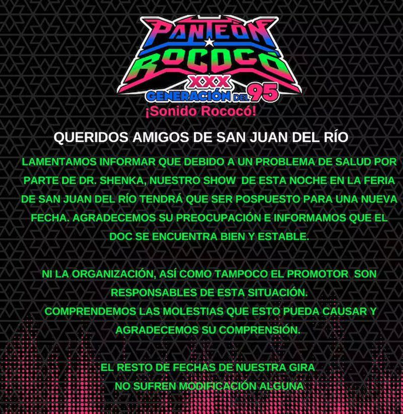 Panteón Rococó tenía previsto presentarse hoy sábado 14 de junio en el Teatro del Pueblo de la Feria San Juan del Río 2025. Sin embargo, el evento tuvo que ser pospuesto debido a que su vocalista, conocido como Dr. Shenka, presentó problemas de salud.