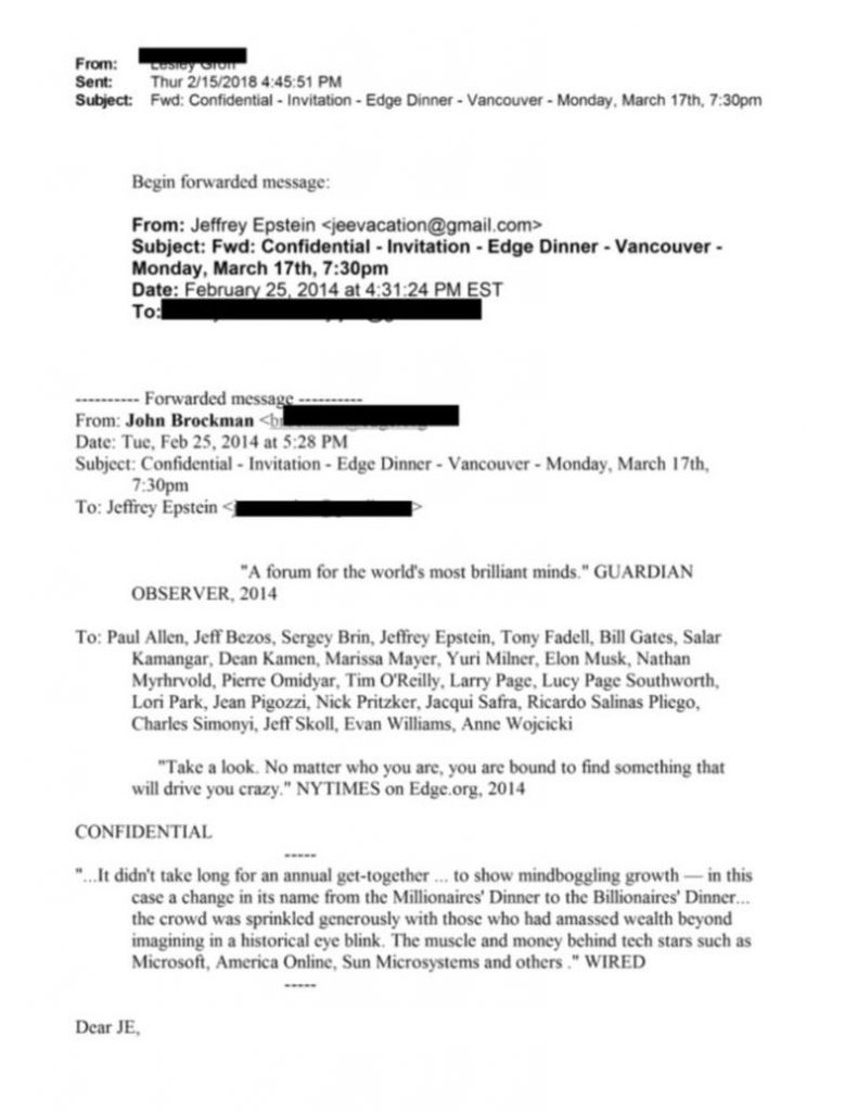 A pesar de esto, Brockman siguió invitándolo por años a las cenas de Edge, junto a empresarios como Jeff Bezzos, fundador de Amazon; Bill Gates, de Microsoft; Larry Page y Sergey Brin, de Google, así como el mexicano Ricardo Salinas Pliego, entre otros.