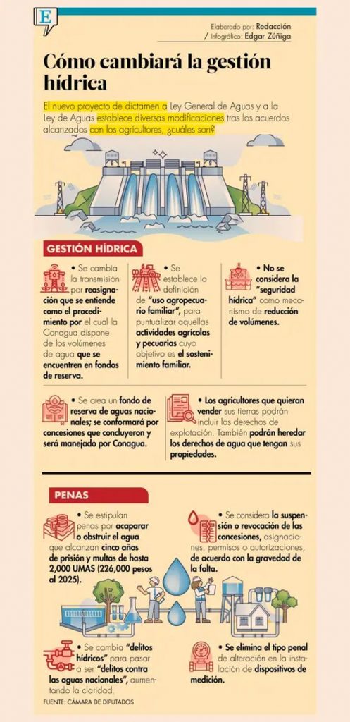 Y es que la propuesta original de la presidenta Sheinbaum advertía que los volúmenes de agua provenientes de los derechos de explotación, uso o aprovechamiento de agua para uso agrícola, ganadero o forestal serían reasignados, lo cual generó preocupación entre el sector campesino.