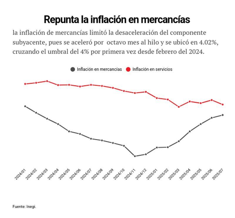Sin embargo, la inflación subyacente, clave para proyectar la tendencia de largo plazo, se mantuvo en 4.23% anual y, dentro de ella, las mercancías se aceleraron por octavo mes consecutivo, a 4.02%, cruzando el umbral de 4% por primera vez desde febrero de 2024.