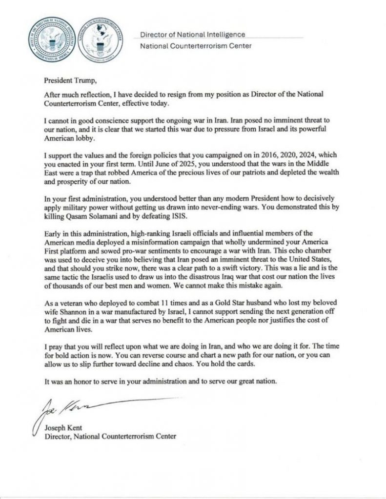 Kent acaba su carta recordando su servicio en el Ejército estadounidense, su participación en operaciones de combate y la pérdida de su esposa “en una guerra impulsada por Israel”. “No puedo apoyar el envío de la próxima generación a luchar y morir en una guerra que no aporta ningún beneficio al pueblo estadounidense ni justifica el coste en vidas americanas”, ha indicado, recalcando al presidente norteamericano que “reflexione” sobre las acciones estadounidenses en Irán y “para quién lo están haciendo”.