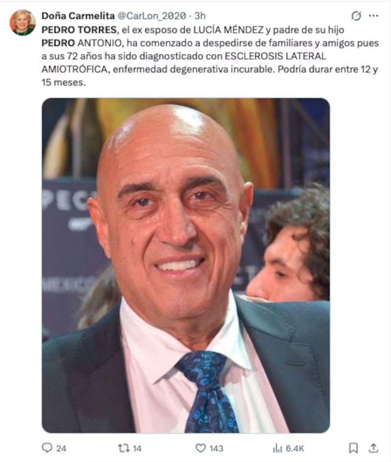 El productor mexicano Pedro Torres enfrenta un complejo panorama de salud después de recibir un diagnóstico de esclerosis lateral amiotrófica (ELA), una enfermedad incurable, según reveló este martes la revista TVNotas.