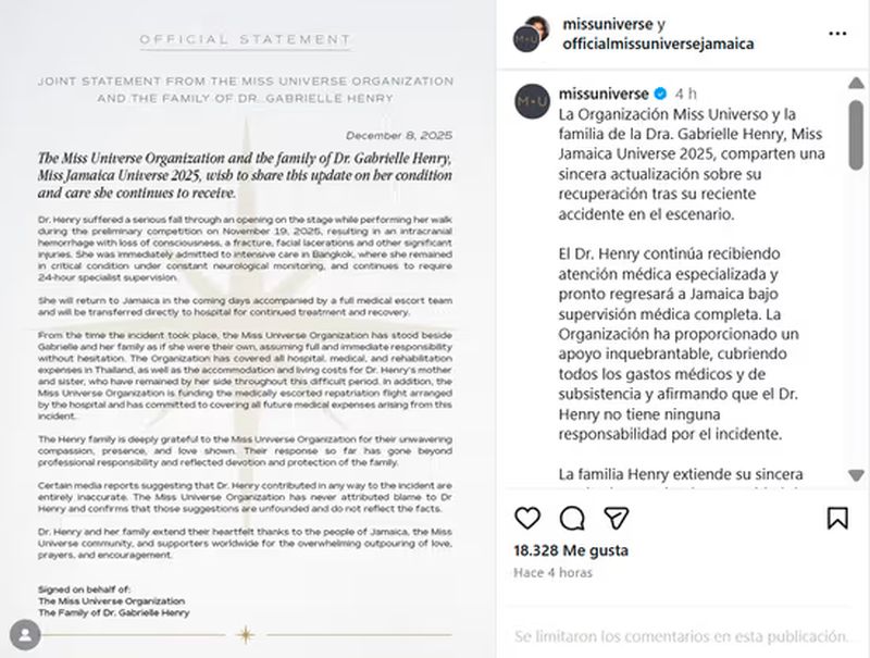 Miss Universe Organization y la familia de Miss Jamaica, Gabrielle Henry, han compartido información de cómo se encuentra ella a días de que sufriera una grave caída durante una competencia preliminar en Miss Universe 2025, el 19 de noviembre.