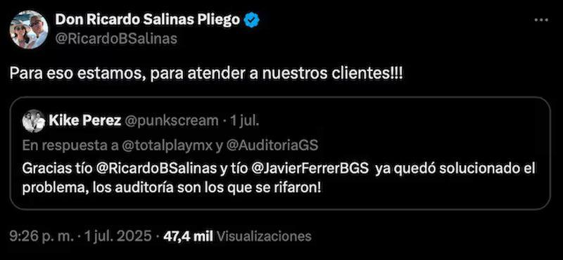 Ante la falta de respuesta por parte del personal de Totalplay, el usuario recurrió directamente al empresario Ricardo Salinas Pliego.