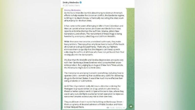 El vicepresidente del Consejo de Seguridad de Rusia, Dmitri Medvédev, acusó al gobierno de Ucrania de reclutar a sicarios de cárteles de narcotráfico de México y Colombia para combatir en el conflicto en curso contra Rusia.