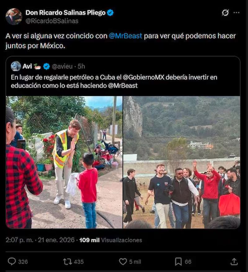 Debido al gran revuelo que generó MrBeast, el dueño de Grupo Salinas reaccionó a la foto del influencer en México y le propuso una colaboración: “A ver si alguna vez coincido con @MrBeast para ver qué podemos hacer juntos por México”, escribió.
