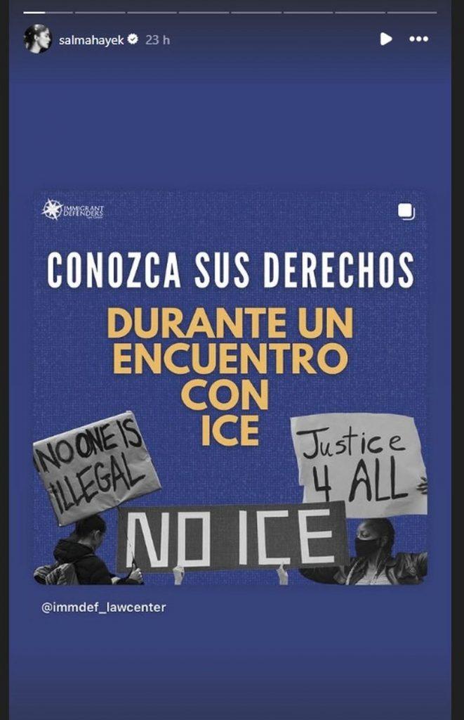 Salma Hayek publicó en sus historias de Instagram una serie de recomendaciones para saber cómo actuar y qué derechos tienen los migrantes.