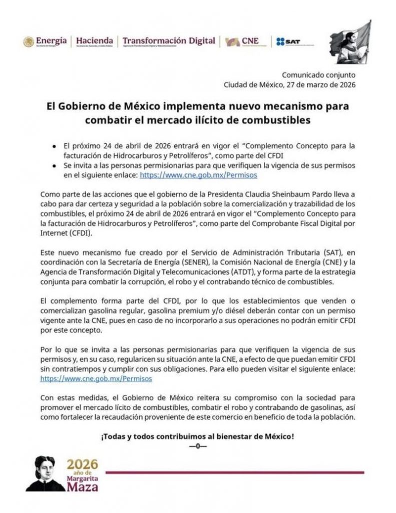 “El Complemento Concepto para la facturación de Hidrocarburos y Petrolíferos forma parte de nuestra estrategia para garantizar que la venta de combustibles se realice de manera lícita y transparente, así como para fortalecer los controles fiscales en este sector estratégico”, indicó el SAT.