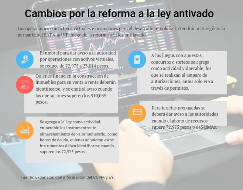 Con los cambios, quienes ofrecen el intercambio de activos virtuales tendrán que dar aviso a las autoridades cuando una persona adquiera estos, por operaciones que superen los 23,814 pesos (210 UMAS), cuando antes eran 72,975.3 pesos (645 UMAS). En todo momento, quien quiera intercambiar activos tendrá que identificarse con documentos oficiales, comprobante de domicilio, datos fiscales, explicó Méndez Rueda.