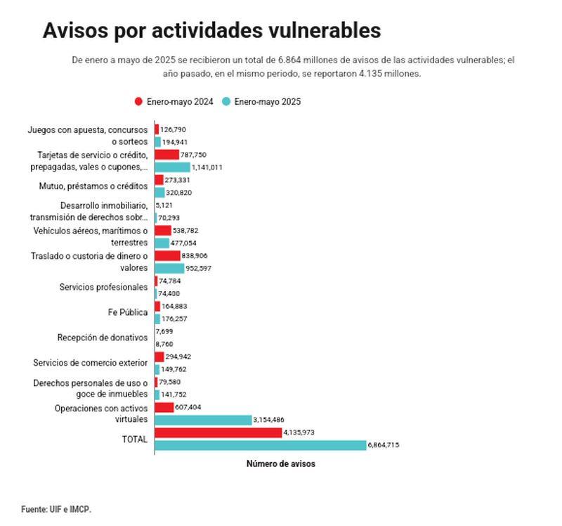 De enero a mayo de este año, la UIF recibió del fisco mexicano, 6.864 millones de avisos de actividades vulnerables, las cuales pueden ser utilizadas para el lavado de dinero o financiamiento al terrorismo. La cifra es mayor en 2.728 millones respecto al número de avisos reportados en enero-mayo del año pasado, cuando fueron 4.135 millones, refieren reportes de la UIF y registros del Instituto Mexicano de Contadores Públicos (IMCP).