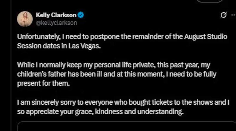 “Lamentablemente, necesito posponer las fechas restantes de agosto en Las Vegas. Aunque normalmente mantengo mi vida privada, este último año el padre de mis hijos ha estado enfermo y en este momento necesito estar presente para ellos”, expresó a través de un comunicado en la plataforma X.