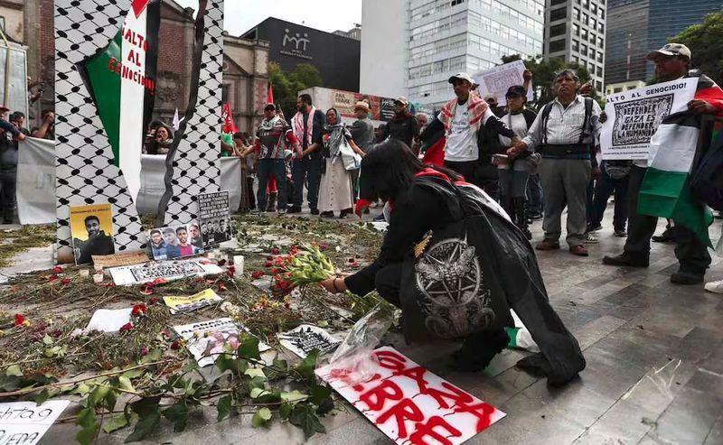 “Este antimonumento reafirma la dignidad, la resistencia, la libertad de autodeterminación del pueblo palestino, aunque se empeñen en arrasar su tierra. La memoria palestina es más fuerte y los insumisos del sur global plantamos hoy, en el corazón de la Ciudad de México esta puerta abierta a la vida, que se suma a la ruta de la memoria que resiste. Exigimos al gobierno mexicano que rompa relaciones diplomáticas y comerciales con Israel”, se lee en el antimonumento colocado frente a la Secretaría de Relaciones Exteriores (SRE).