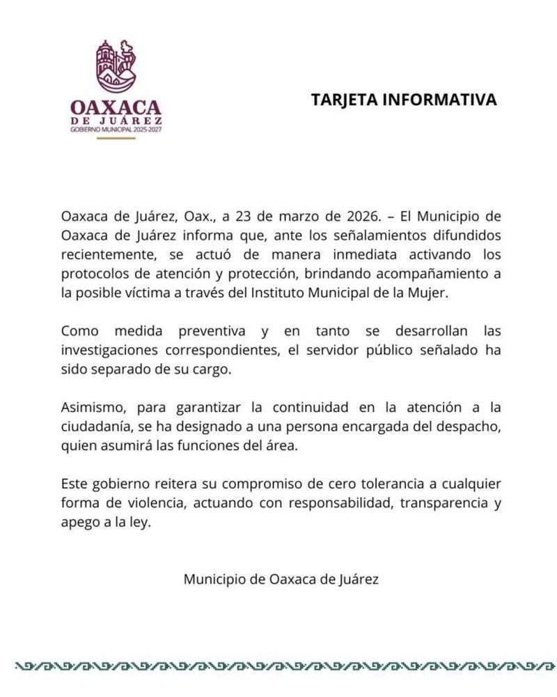 Separan del cargo a funcionario municipal en Oaxaca tras denuncia por presunto intento de violación
