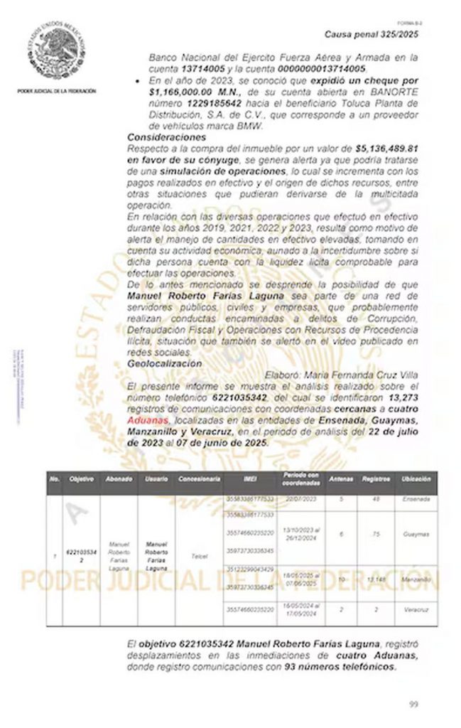 “De lo antes mencionado se desprende la posibilidad de que Manuel Roberto Farías Laguna sea parte de una red de servidores públicos, civiles y empresas, que probablemente realizan conductas encaminadas a delitos de corrupción, defraudación fiscal y operaciones con recursos de procedencia ilícita, situación que también se alertó en el video publicado en redes sociales”, describe el documento.