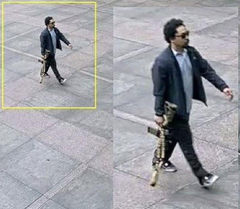 Una imagen que ya circula en medios muestra al hombre caminando de forma segura y calmada con el rifle de asalto en la mano derecha.