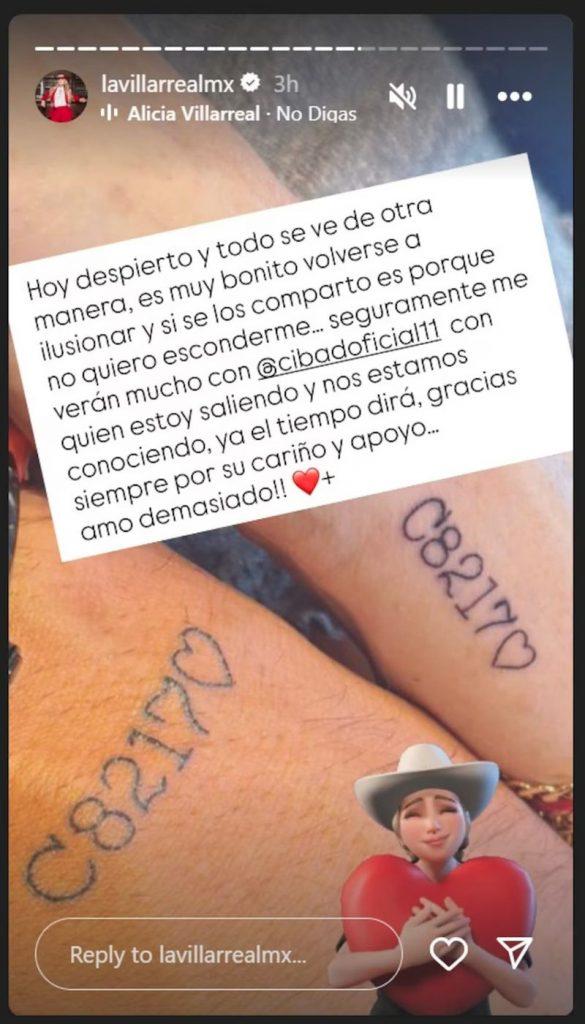 En este nuevo capítulo, Alicia Villarreal ha optado por la transparencia, publicando en sus historias de Instagram una fotografía en la que se observan los brazos de la pareja, cada uno con un tatuaje que incluye una letra, números y un corazón: “C8217”.