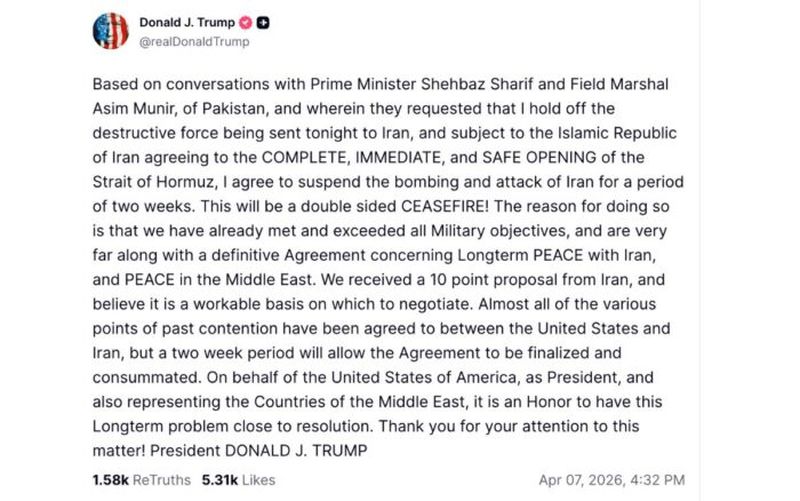 “Recibimos una propuesta de 10 puntos de Irán y creemos que constituye una base viable para la negociación. Estados Unidos e Irán han acordado casi todos los puntos de controversia anteriores, pero dos semanas permitirán finalizar y concretar el acuerdo”, publicó Trump a las 4:32 de la tarde del martes 7 de abril (tiempo de México), una hora y media antes de que llegara la hora de su ultimátum.