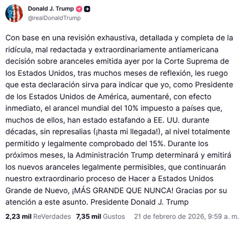 El presidente de Estados Unidos, Donald Trump, dijo este sábado que subirá a un 15 % el nuevo arancel a las importaciones de todos los países que aprobó ayer después de que el Supremo fallara en contra de su política de gravámenes.