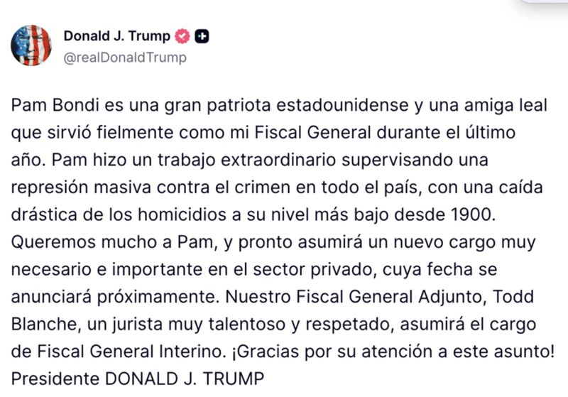 “Nuestro fiscal General Adjunto -una mente jurídica sumamente talentosa y respetada-, Todd Blanche, asumirá el cargo de fiscal general interino”, concluye el escrito.
