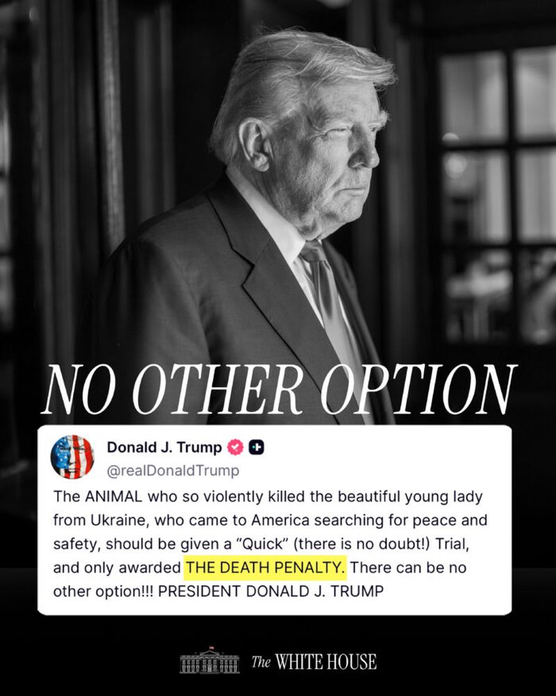 “El ANIMAL que mató tan violentamente a la hermosa joven de Ucrania, quien vino a Estados Unidos buscando paz y seguridad, debe recibir un juicio ‘rápido’ (¡no hay duda!) y ser sentenciado ÚNICAMENTE con la PENA DE MUERTE. ¡¡¡No puede haber otra opción!!!”, escribió Trump en su red social, Truth Social.